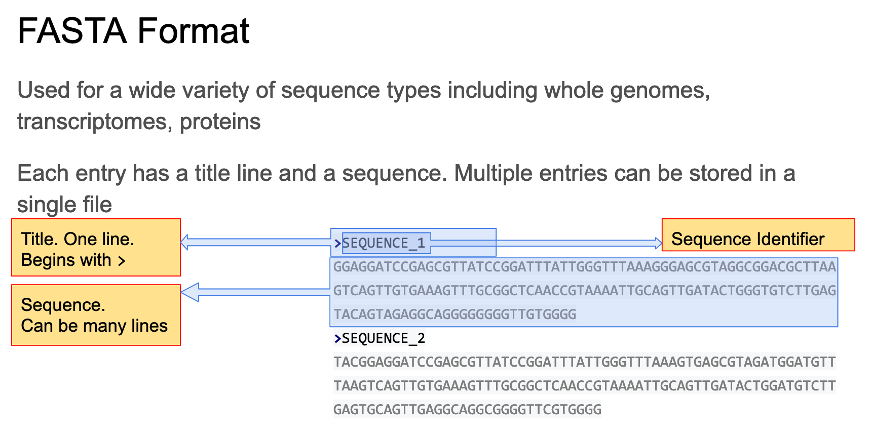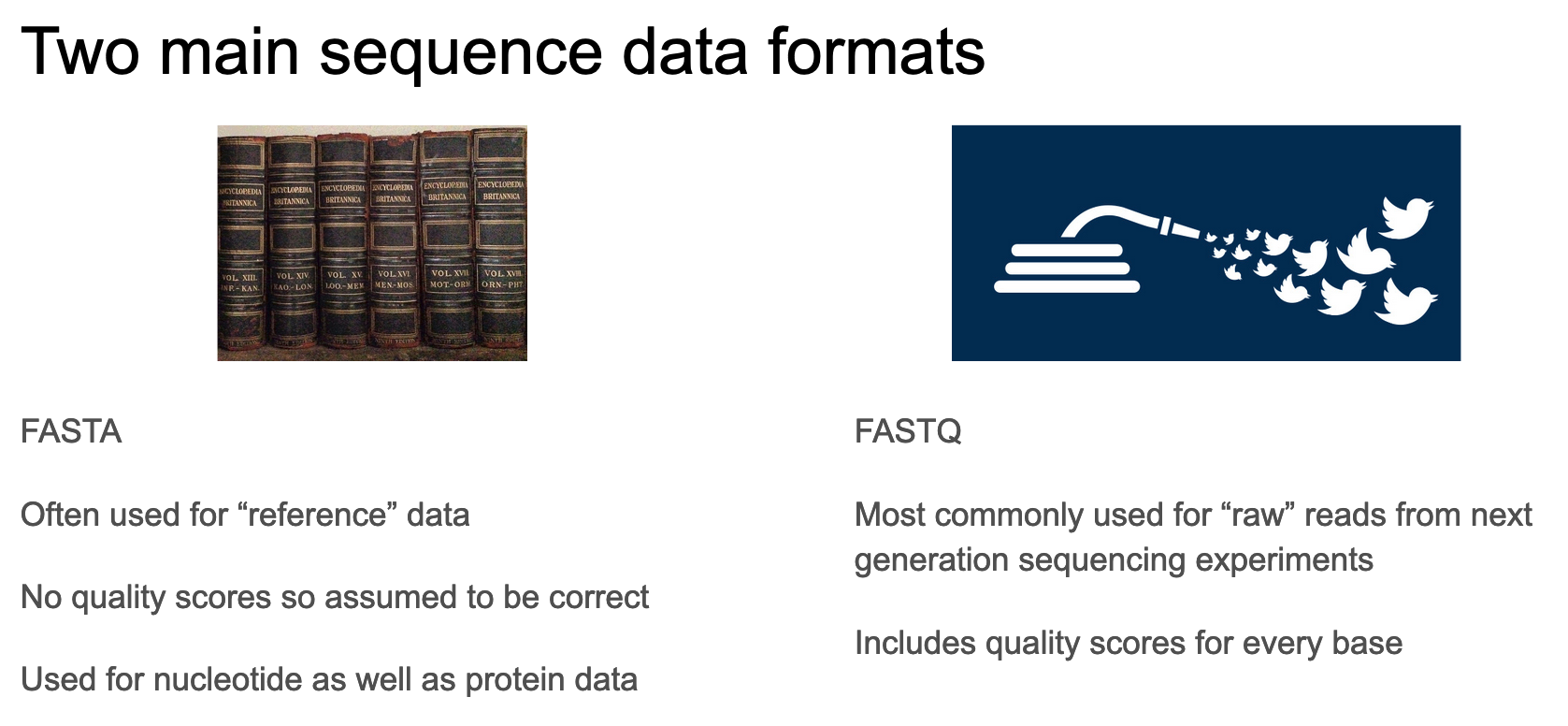 These are the two common formats for storing sequence information. How do they differ?