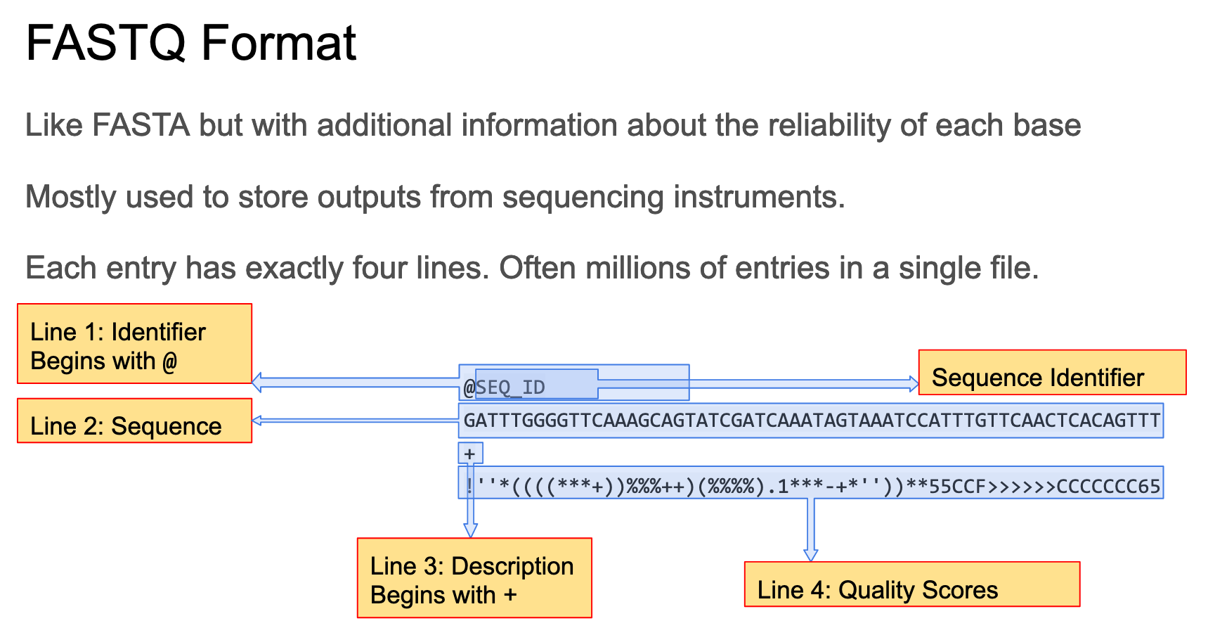 We created a fasta file in the previous section but let’s look closer at fasta and fastq formats.